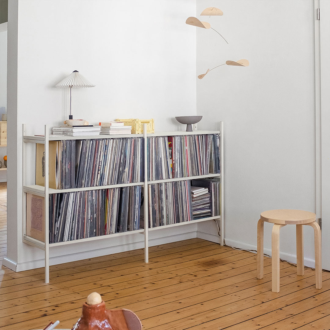 The Portal shelf system works perfectly as a vinyl shelf. With 32 cm between each shelf, the vinyl records fit perfectly.