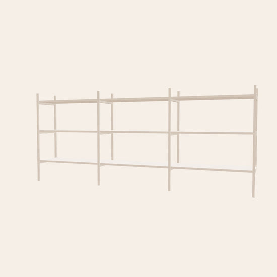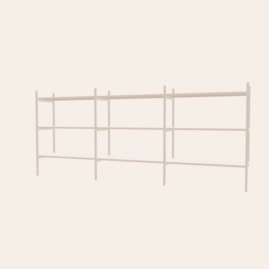 A perfect bookshelf for your living room in the color off-white. The open sections provide space for a painting or a larger lamp. This combination is 236 cm wide.