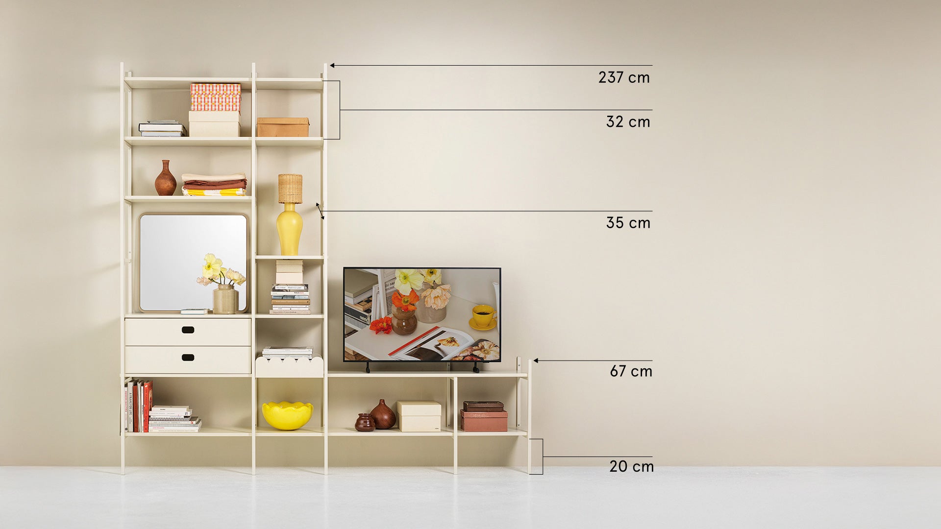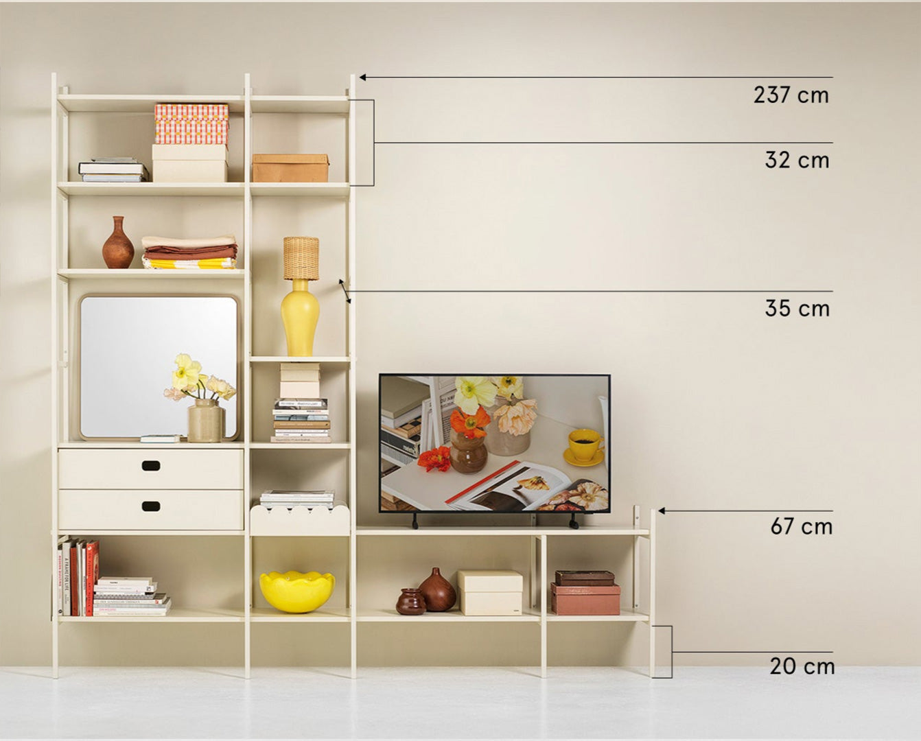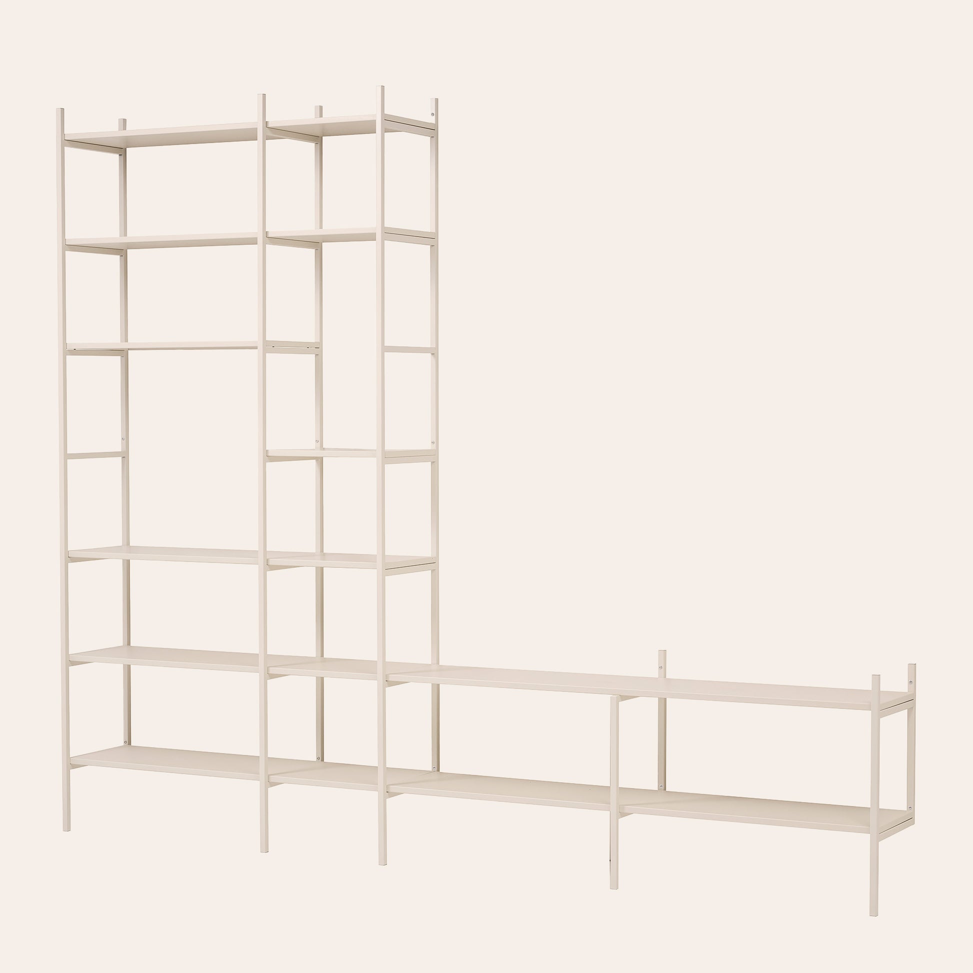 TV shelf in off-white – stylish storage and TV solution in one. The low section holds your TV in a discreet way, while the tall section offers plenty of space for books and personal items. Together, they form a cohesive solution that brings everything together in one place. This combination is 279 cm wide.