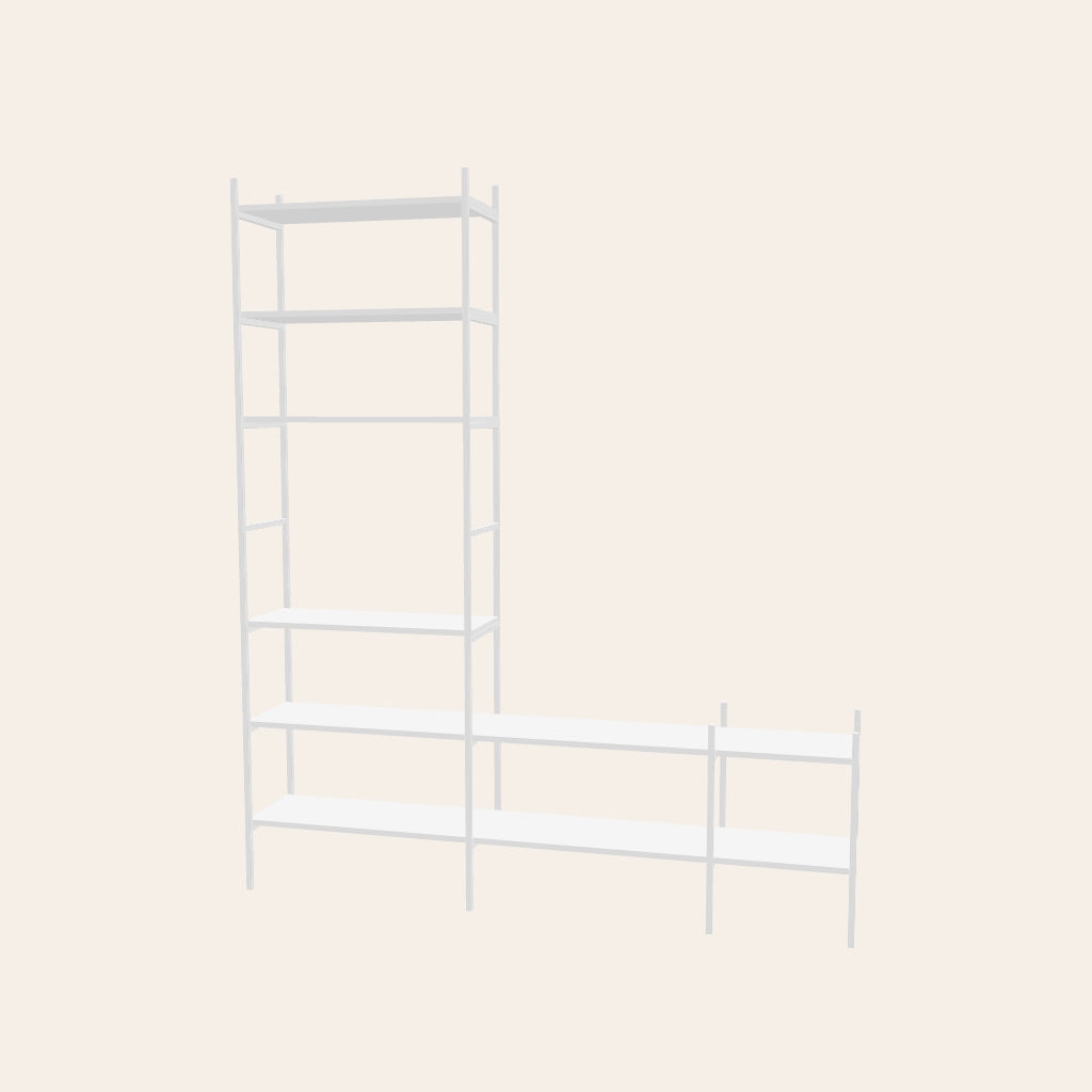 TV shelf in white – stylish storage and TV solution in one. The low section holds your TV in a discreet way, while the tall section offers plenty of space for books and personal items. Together, they form a cohesive solution that brings everything together in one place. This combination is 201 cm wide.