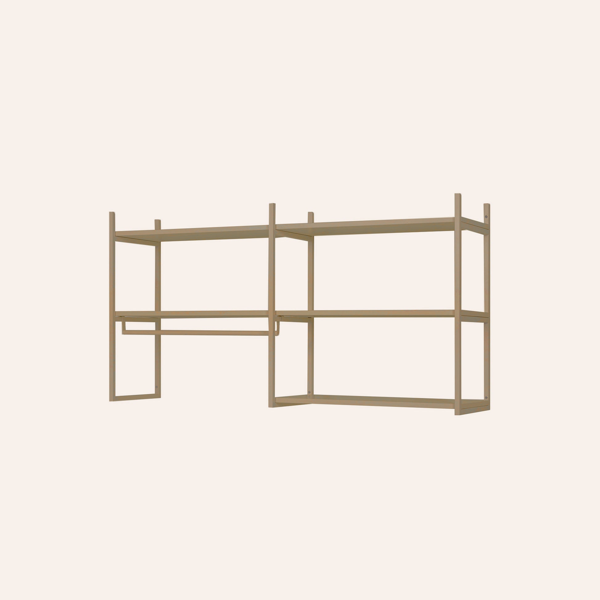 Wall-mounted open shelf in camel, perfect for the kitchen, living room or kids’ room. Add a clothing rod to hang everything from kitchen utensils to clothes – a playful solution for practical storage. This combination is 158 cm wide.