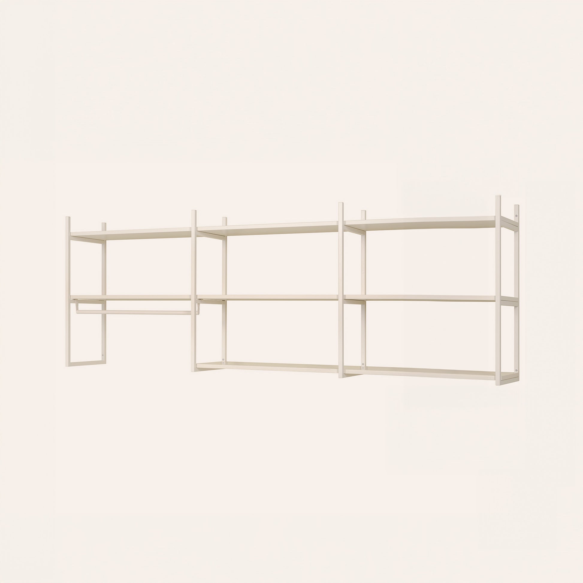 Wall-mounted open shelf in off-white, perfect for the kitchen, living room or kids’ room. Add a clothing rod to hang everything from kitchen utensils to clothes – a playful solution for practical storage. This combination is 236 cm wide.
