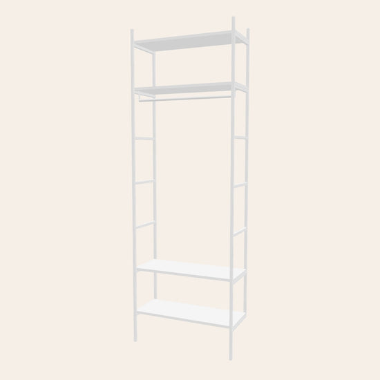 Ein stilvolles Flurregal in Weiß für Ordnung und Stil im Eingangsbereich. Mit Kleiderstange für Haken und Bügel, Ablageflächen für Schuhe und Platz für alles, was im Flur seinen Platz finden soll. Praktisch, luftig und schön. Diese Kombination ist 80 cm breit.