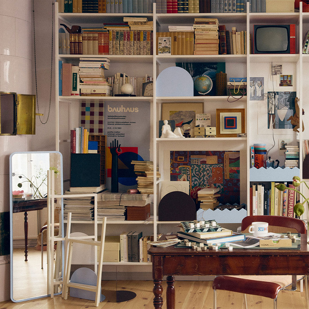 Bokstöd Paus är en mjuk oval till stöd för dina böcker. Välj mellan olika färger som antingen matchar med hyllplanen eller skapa en fin kontrast i din hylla.