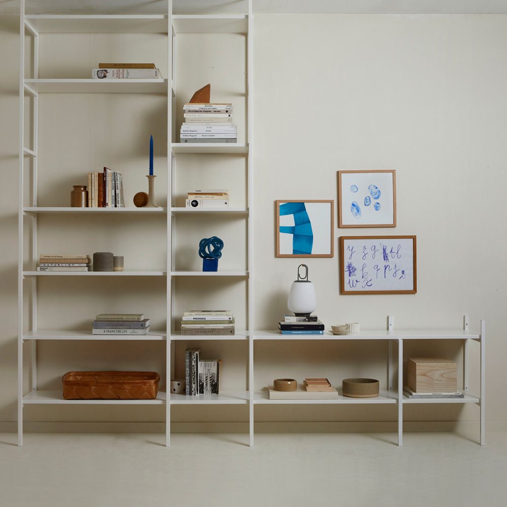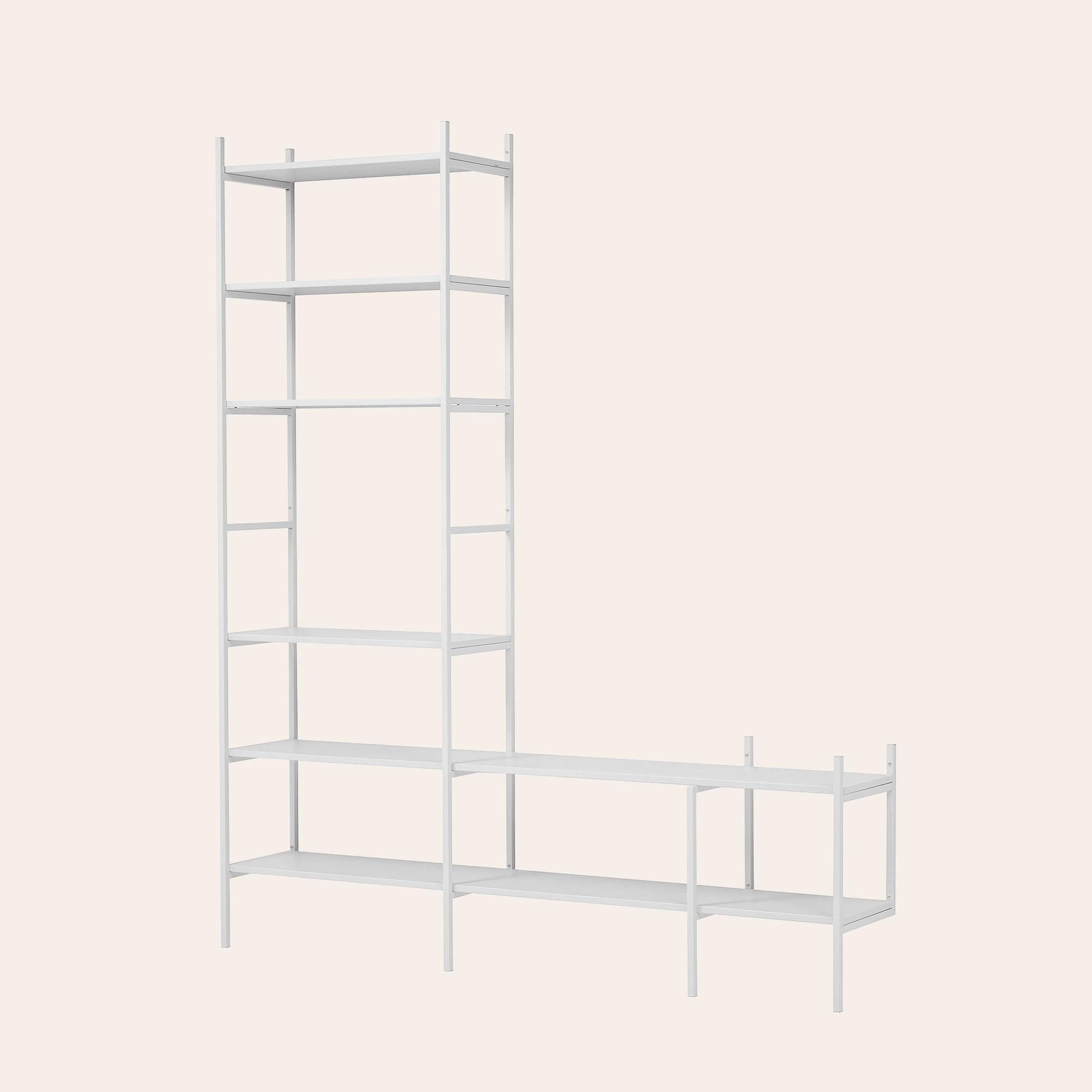 TV-hylla i färgen vit – stilren förvaring och TV-lösning i ett. Den låga delen rymmer din TV på ett diskret sätt, medan den höga delen ger gott om plats för böcker och personliga föremål. Tillsammans bildar de en enhetlig lösning som samlar allt på ett ställe. Denna kombination är 201 cm bred.
